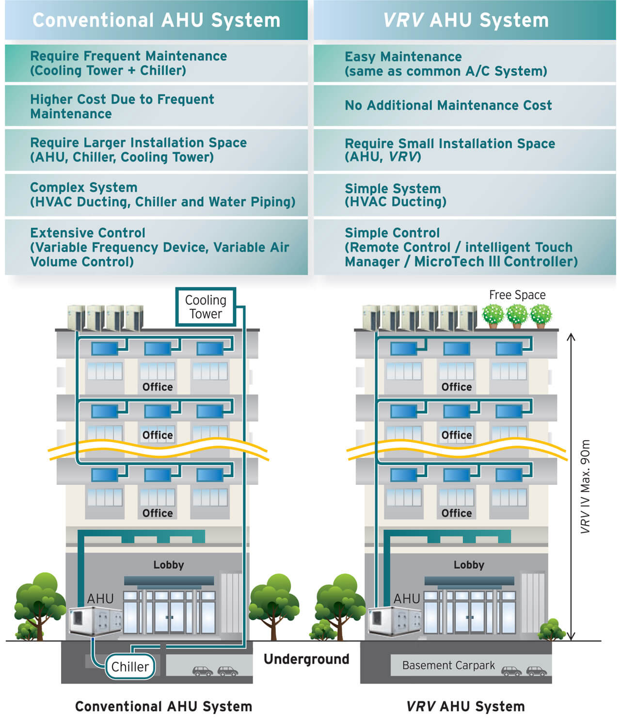 + Hình bên trái : là dùng hệ thống Chiller có dàn trao đổi nhiệt AHU và kèm theo một hệ thống VRV.