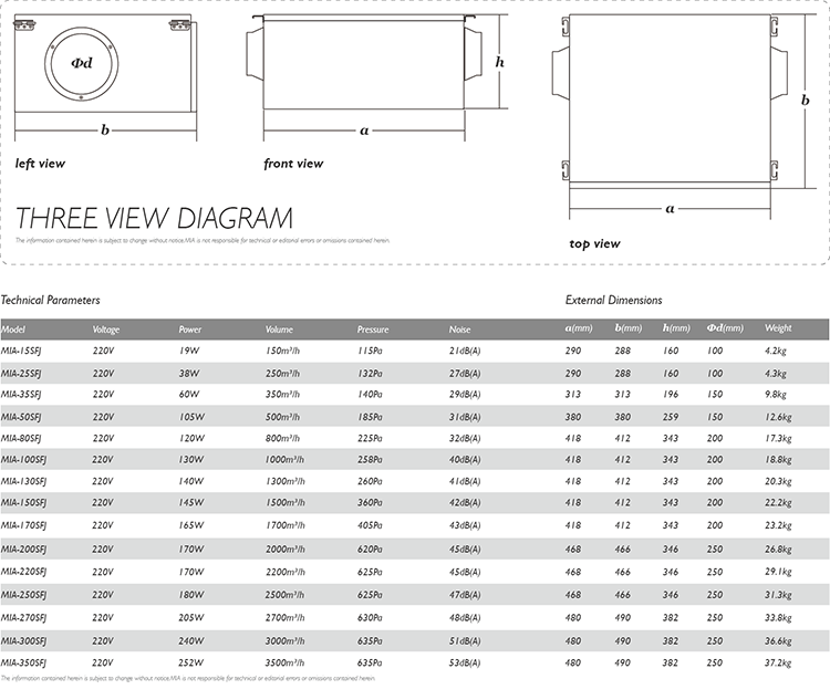 Giải thông số kỹ thuật chung của quạt cấp khí tươi có lọc MIA lưu lượng từ 150m3/h đến 3500m3/h: