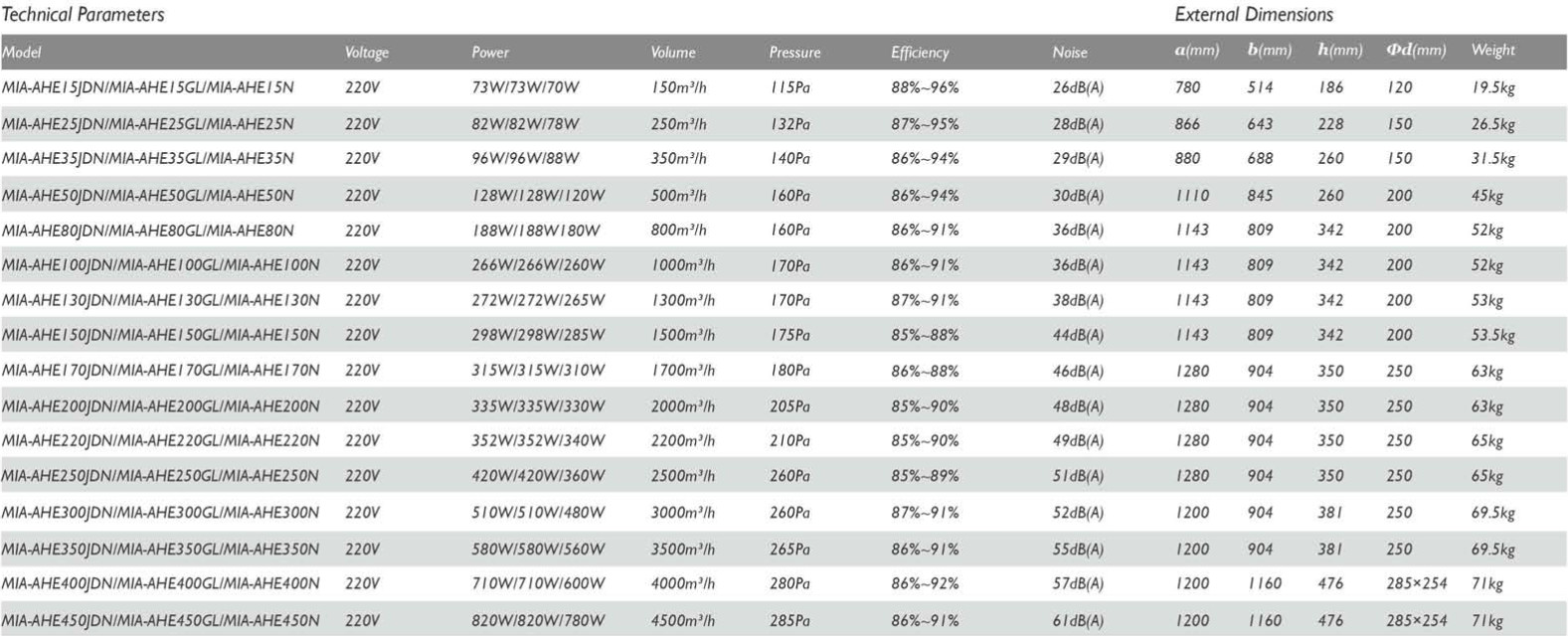 Bảng thông số kỹ thuật của Thiết bị thông gió thu hồi nhiệt