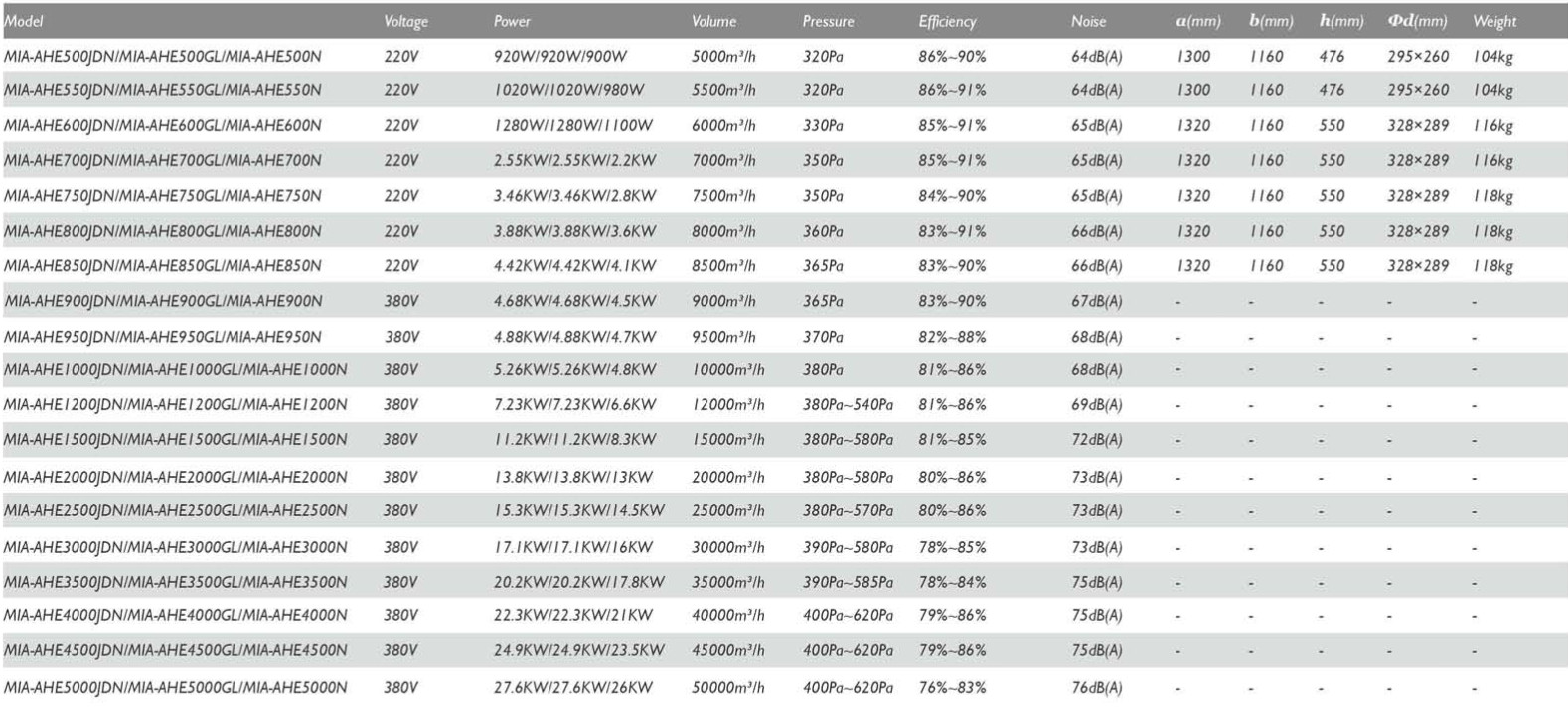1, Thông tin chung: Giải thông số kỹ thuật chung của Quạt thông gió cấp khí tươi thu hồi nhiệt (dân dụng) lưu lượng từ 150m3/h đến 5000m3/h:
